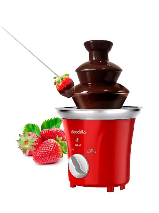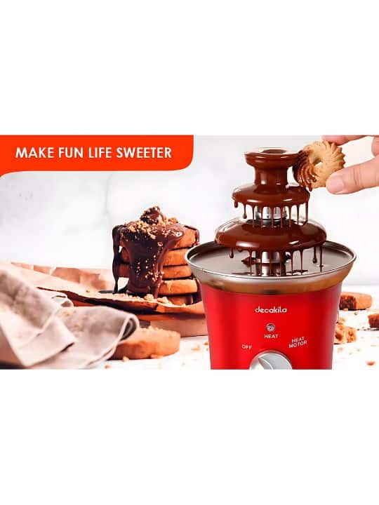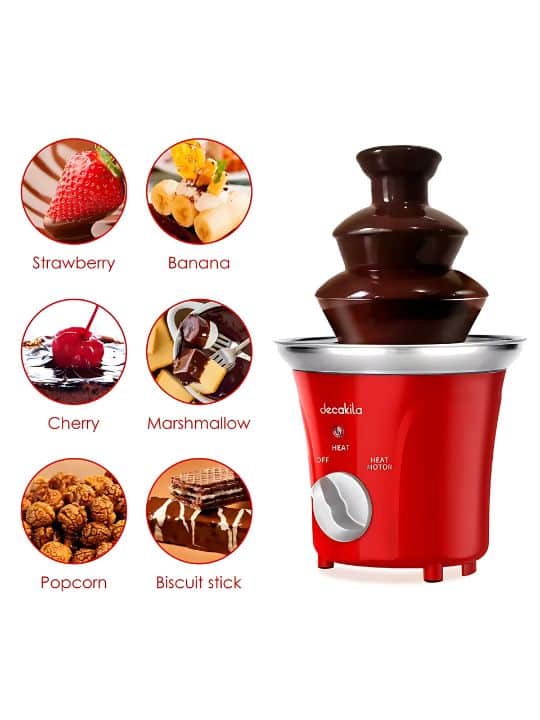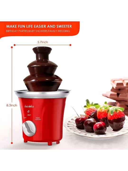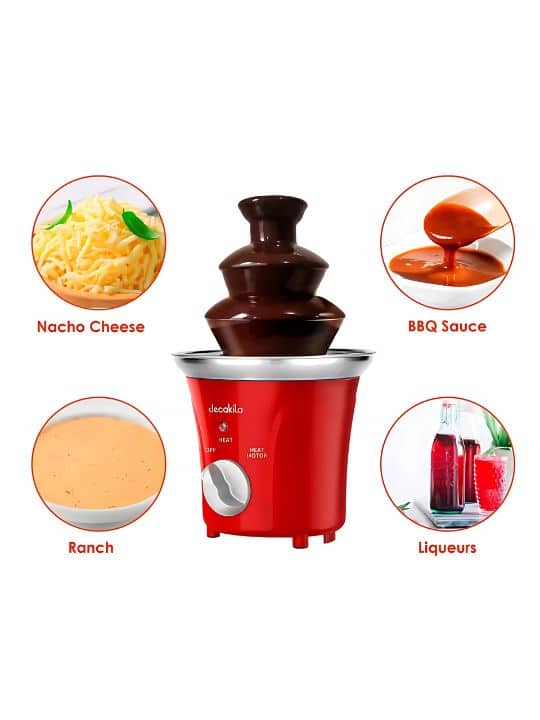 The 3-tier chocolate fountain is perfect for family gatherings or parties with friends. The rich, silky sauce can be enjoyed with strawberries, apple slices, cherries, marshmallows, popcorn, vegetables and more to add to the fun in your life.