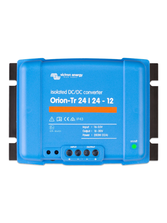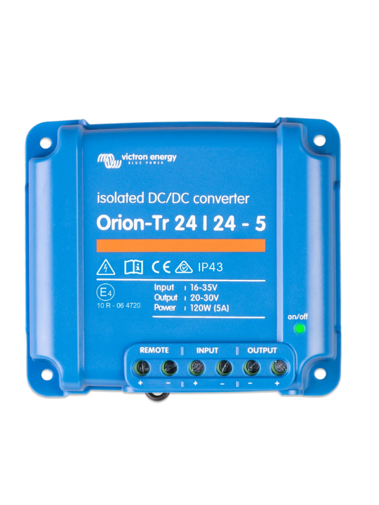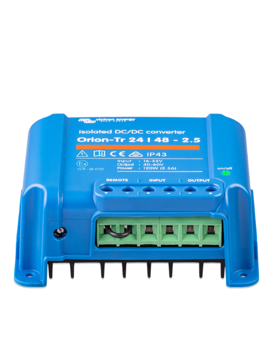 - Remote On/Off: The Orion-Tr includes a remote on/off terminal, which eliminates the need for a heavy current switch in the input wiring and allows control via a low-power switch or e.g. engine run/stop switch.
